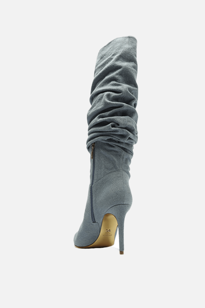 Bota na cor azul confeccionada em jeans. O modelo possui cano alto com efeito amassado, salto alto fino e bico fino.