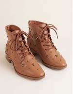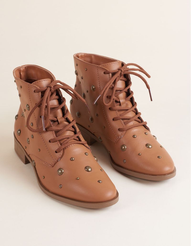 Essa bota em couro vestuário é cheia de personalidade! Seu cabedal apresenta detalhes de metais de diferentes tamanhos, adicionando um toque de estilo único. O cadarço rolotê, no tom do couro, complementa o visual. Além disso, possui forro, palmilha e solado baixo. Material: couro e metal. Nas cores: caramelo e preto.