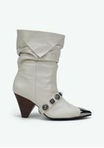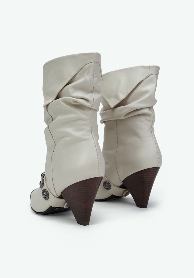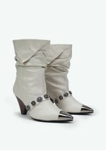 A bota em couro com bico fino metalizado e salto médio é um ícone fashion. O cano possui caimento, tornando o look ainda mais estiloso. A tira com aplicações dão um toque de elegância a mais! aposte.