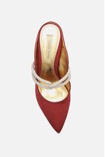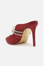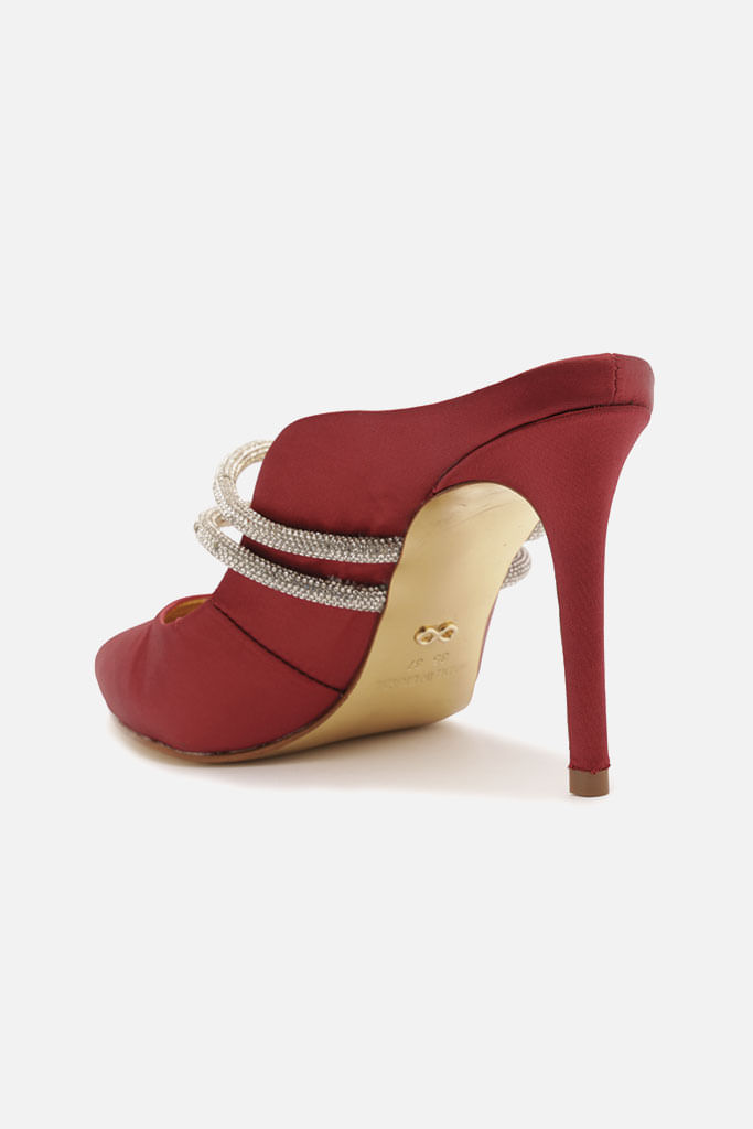 Mule na cor preta confeccionada em cetim. O modelo possui salto alto fino, bico fino e duas tiras de strass entrelaçadas no centro sobre o peito do pé. Aberta na parte de trás, exibindo o calcanhar.