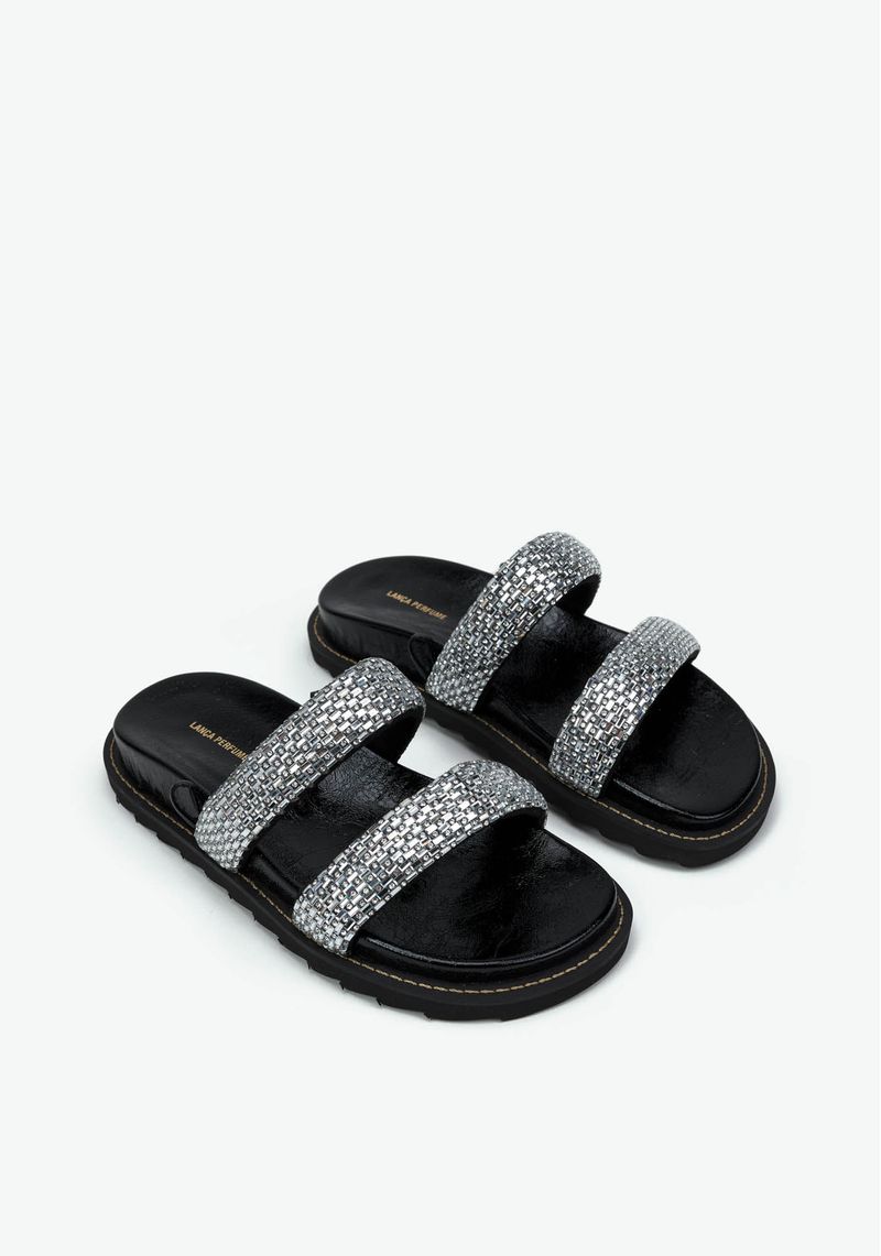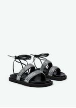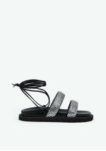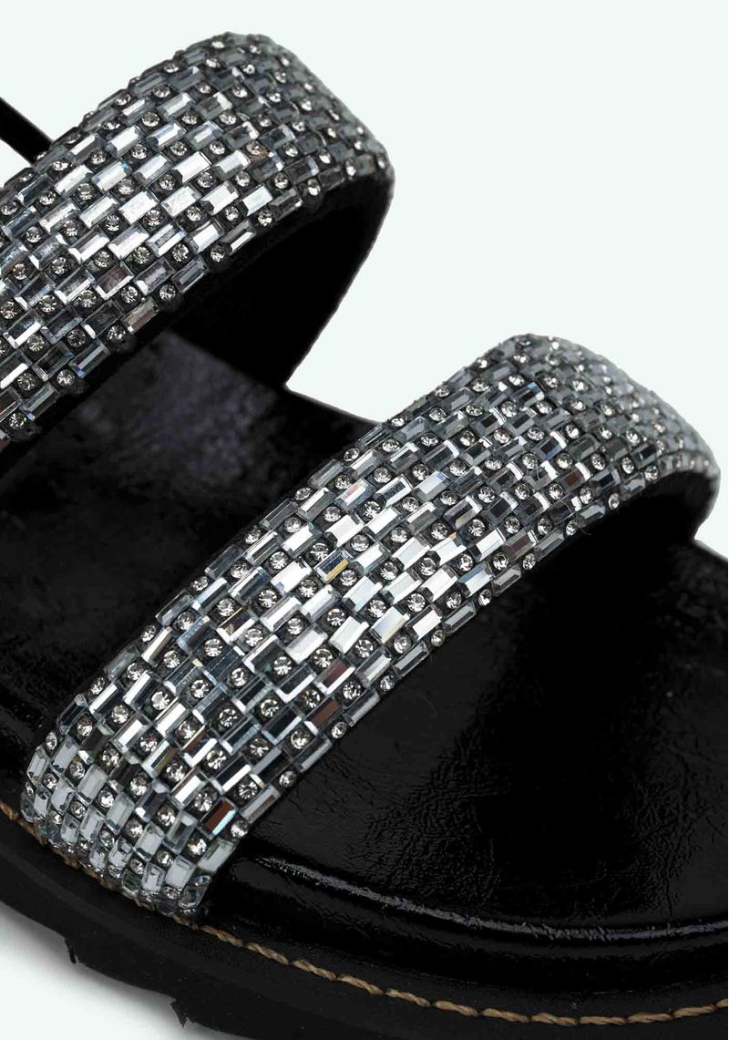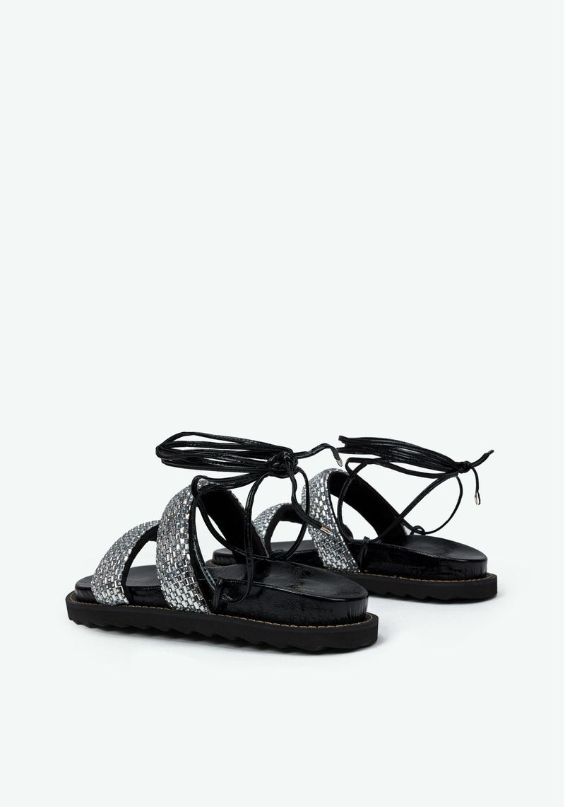 A papete é uma opção descolada que remete a tendência dos anos 2000. Com tiras largas cobertas por strass, a peça garante sofisticação aos looks. A papete possui bico redondo e palmilha anatômica. As tiras para amarração na perna complementam o e