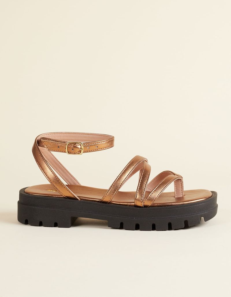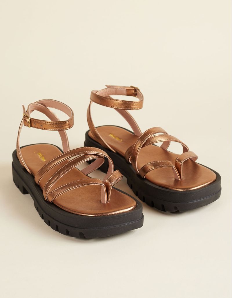 O brilho do material soft, alternativo ao couro metalizado, traz todo o glamour para essa plataforma. Cabedal de tiras retas, fechamento em fivela, palmilha combinando e sola tratorada com detalhe de vira fazem dela a escolha ideal para arrasar no look.