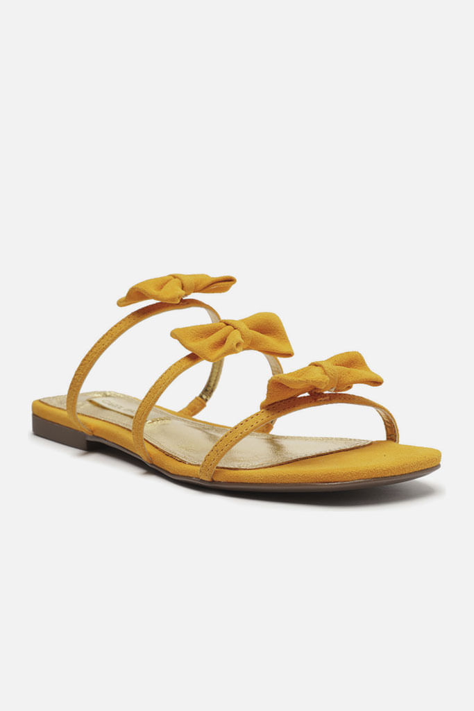 Mule preto. O modelo tem salto rasteiro e bico quadrado. Traz três conjuntos de tiras finas sobre os dedos e peito do pé, com aplicação de laço na parte superior.