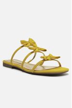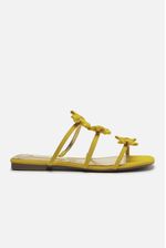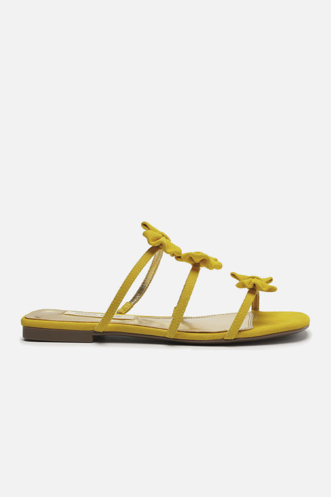 Mule preto. O modelo tem salto rasteiro e bico quadrado. Traz três conjuntos de tiras finas sobre os dedos e peito do pé, com aplicação de laço na parte superior.