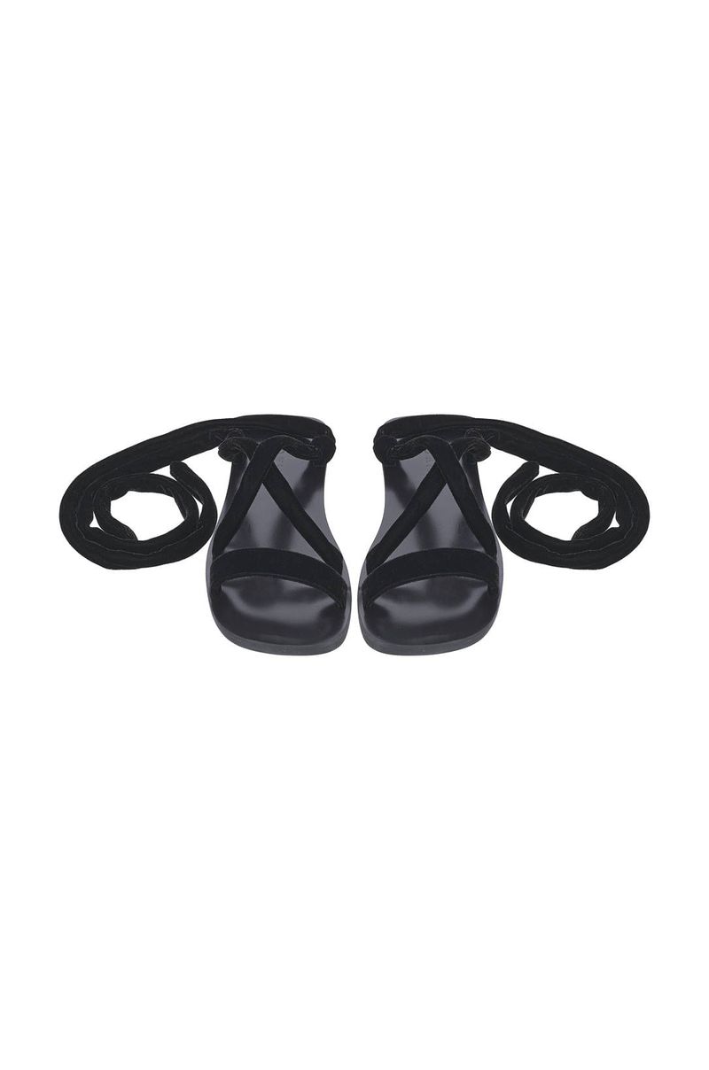 A Rasteira Eva é confeccionada em veludo e couro. O modelo apresenta bico quadrado. Possui tiras em veludo cruzadas sobre o pé, proporcionando um visual moderno e sofisticado. Fechamento de tiras sobre o tornozelo.