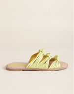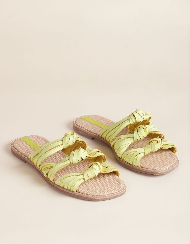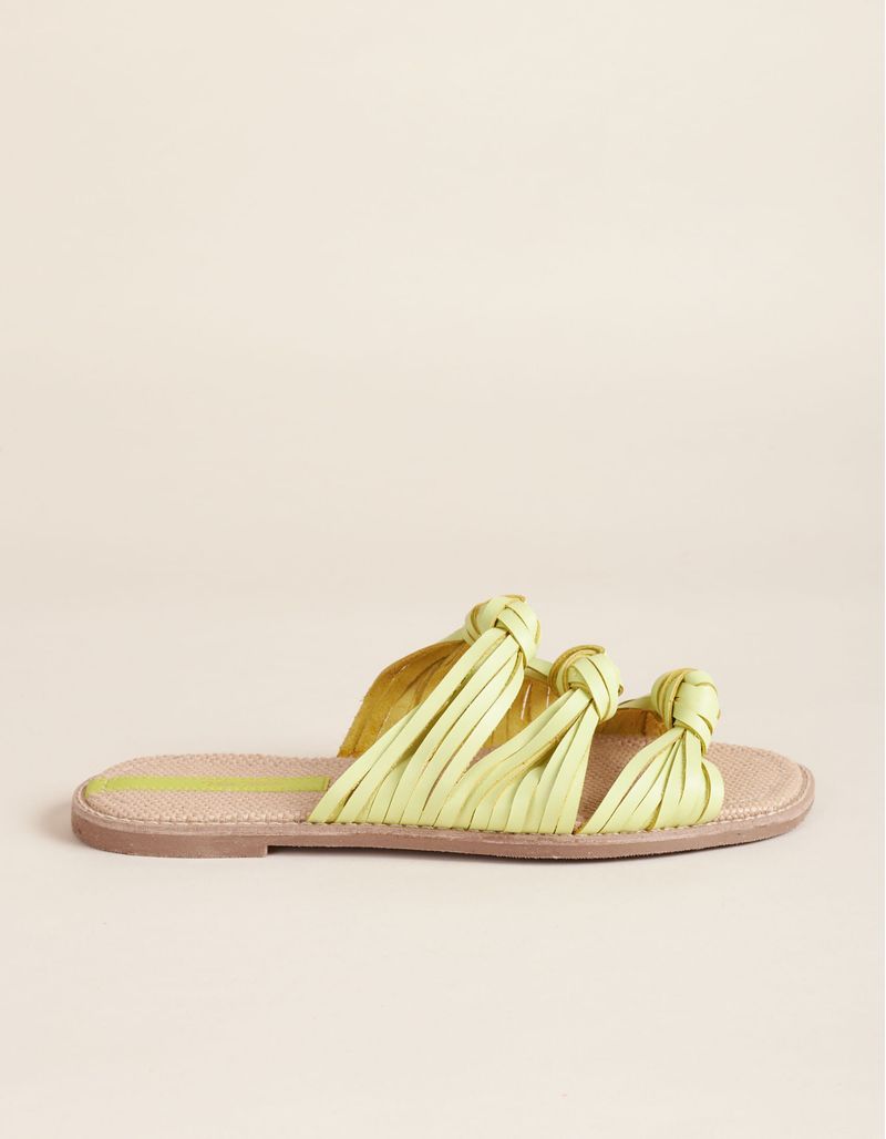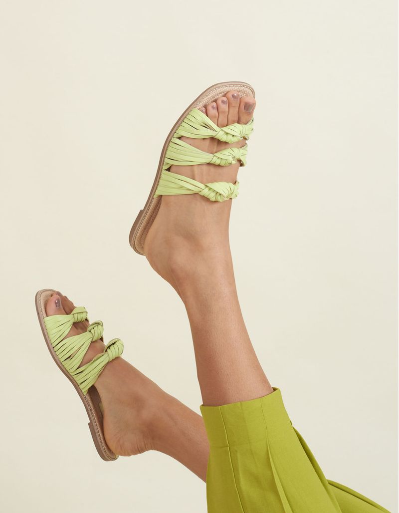 Essa rasteira é a cara do verão! Ela é daquele estilo de sandália "de enfiar o pé", possui três tiras de nó feitas de couro e a palmilha é feita de ráfia. Perfeita para ser usada com roupas como shorts, saias, vestidos e calças jeans, adicionando um toque de estilo ao look. Material: couro. Nas cores: camel, off white e verde limão.