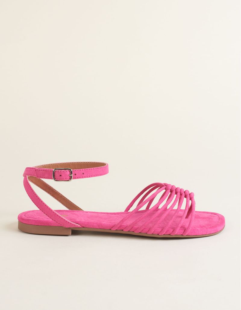 Uma rasteira com muitas tiras! Ela é toda no material suede, com fechamento de fivela na altura do tornozelo e possui múltiplas tiras, com detalhe de macramê. Material: soft. Nas cores: caramelo, pink e preto.