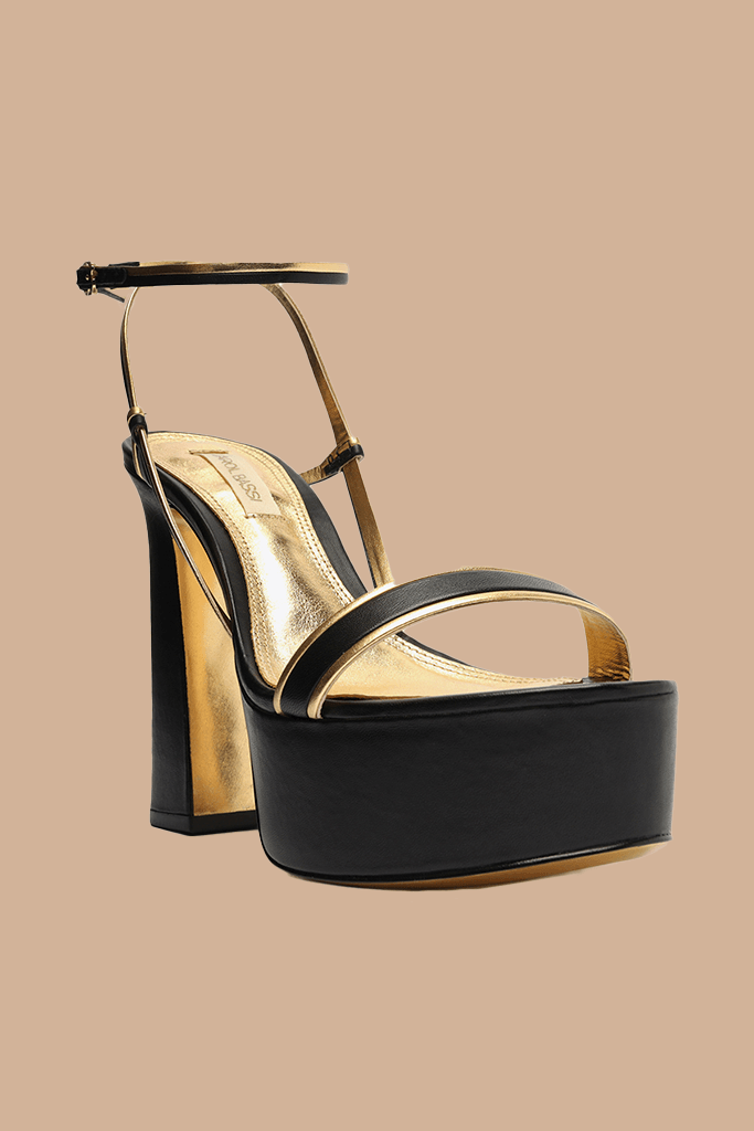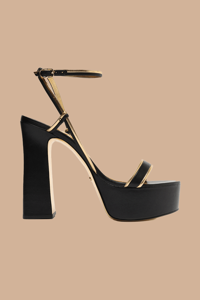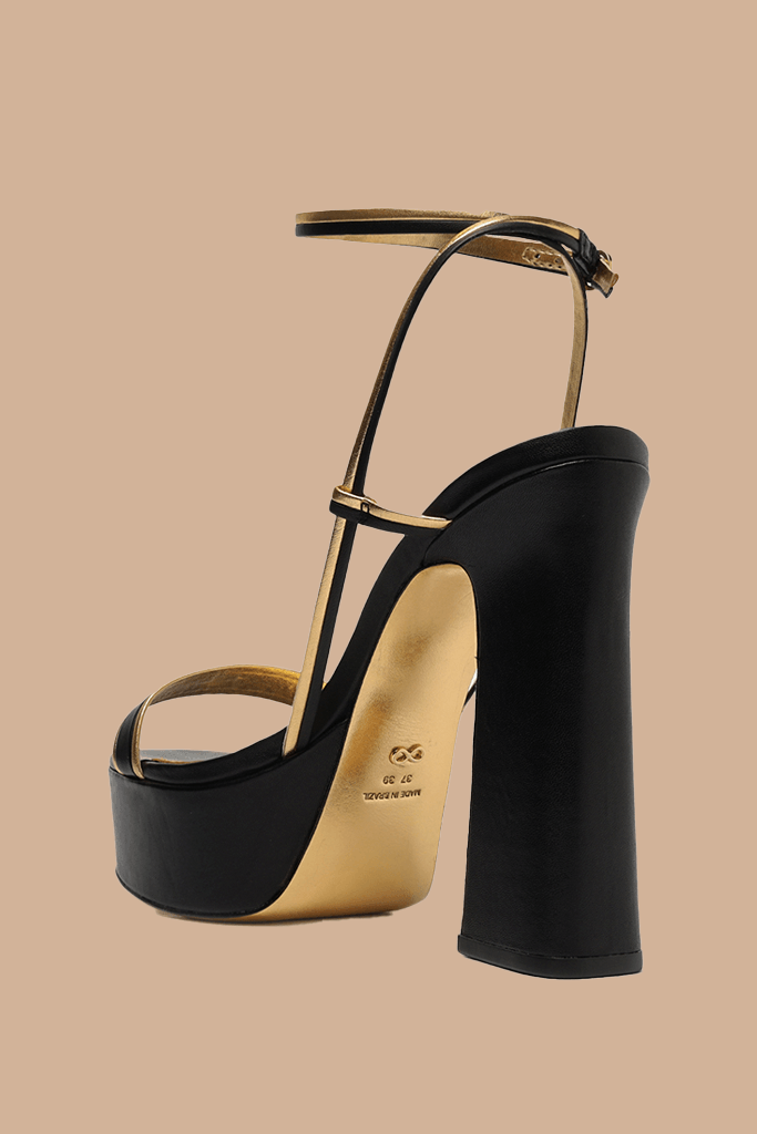 Sandália preta confeccionada em napa. A sandália é meia pata, possui salto grosso, detalhes em dourado, uma tira para amarração no tornozelo e uma sob os dedos, deixando-os á mostra.