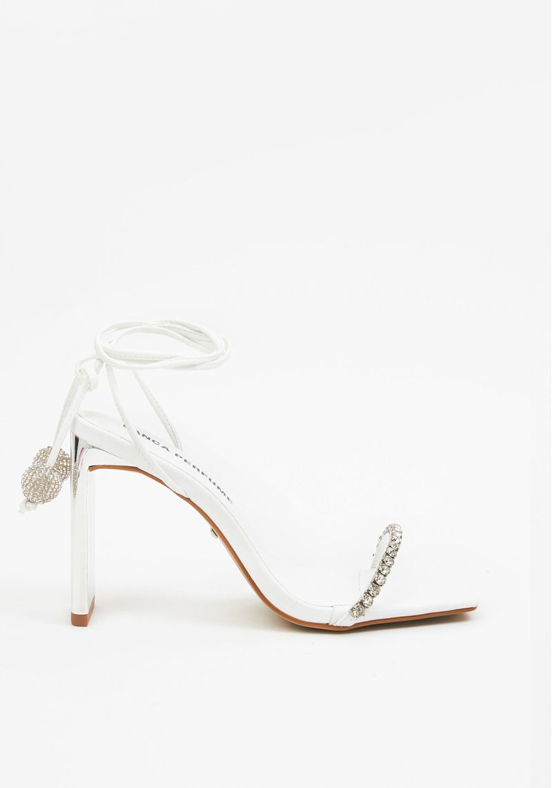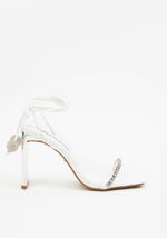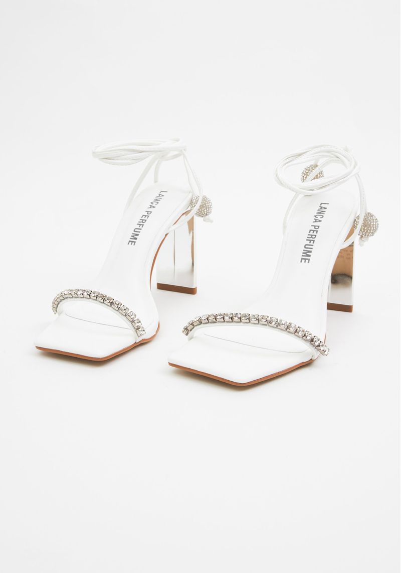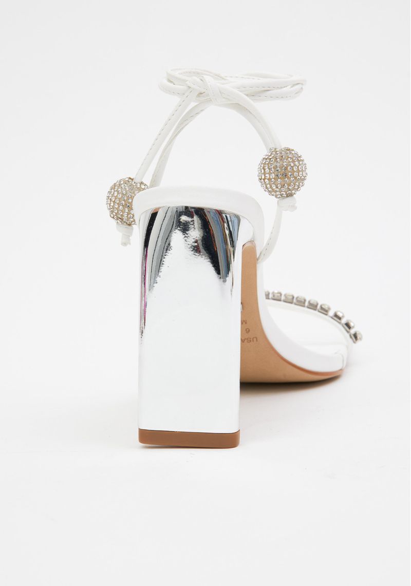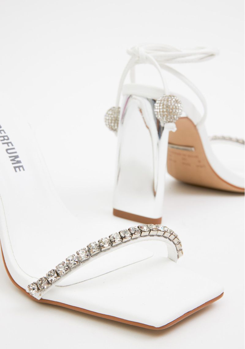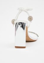 A sandália metalizada de salto alto, bico quadrado e com aplicação de strass na tira, é uma versão moderna e cheia de personalidade. O detalhe espelhado no salto vai destacar ainda mais suas produções. Aposte e arrase!
