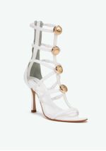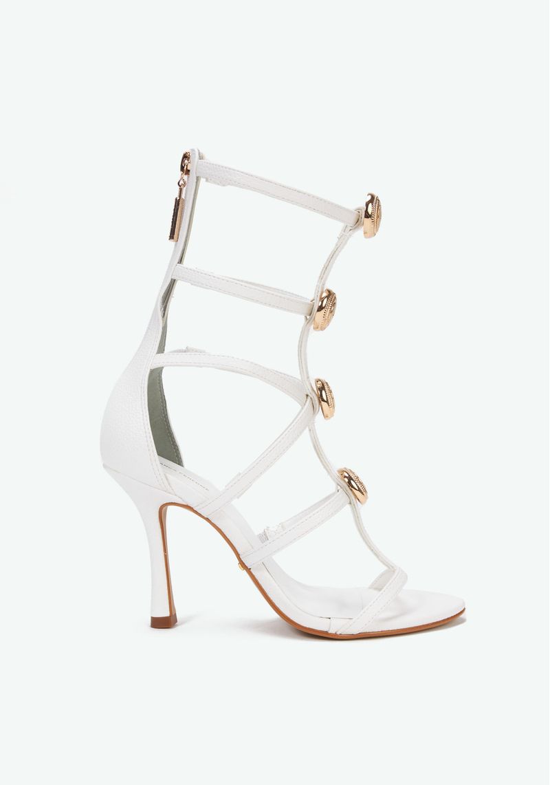Sandália gladiadora apresenta bico redondo, tiras com rebites metalizados e fecho por zíper. Aposte!